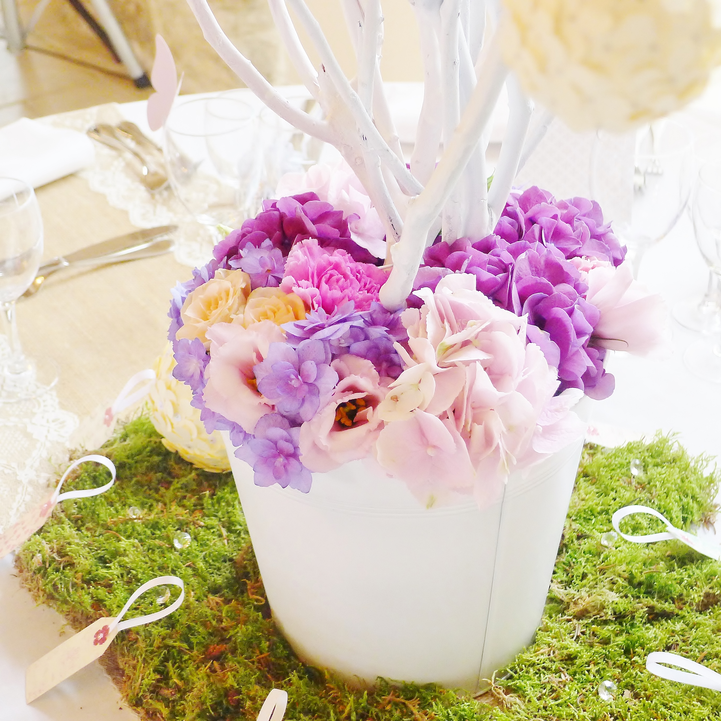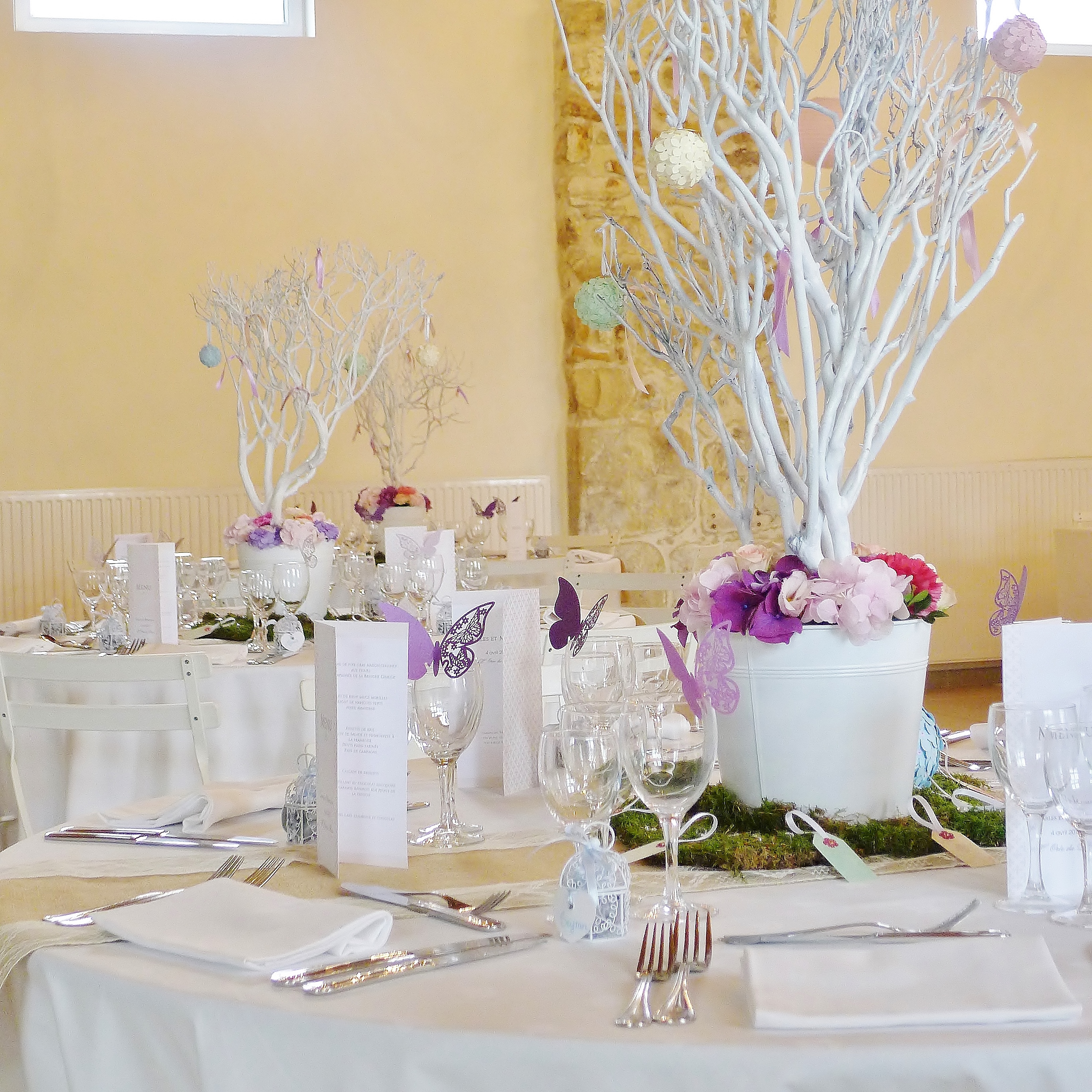 Durant la récéption, les invités peuvent écrire des petits mots à accrocher sur les branches de l’arbre. La salle est décorée grâce à ces tables majestueuses, les pots peuvent prendre toutes les couleurs ainsi que les fleurs.
