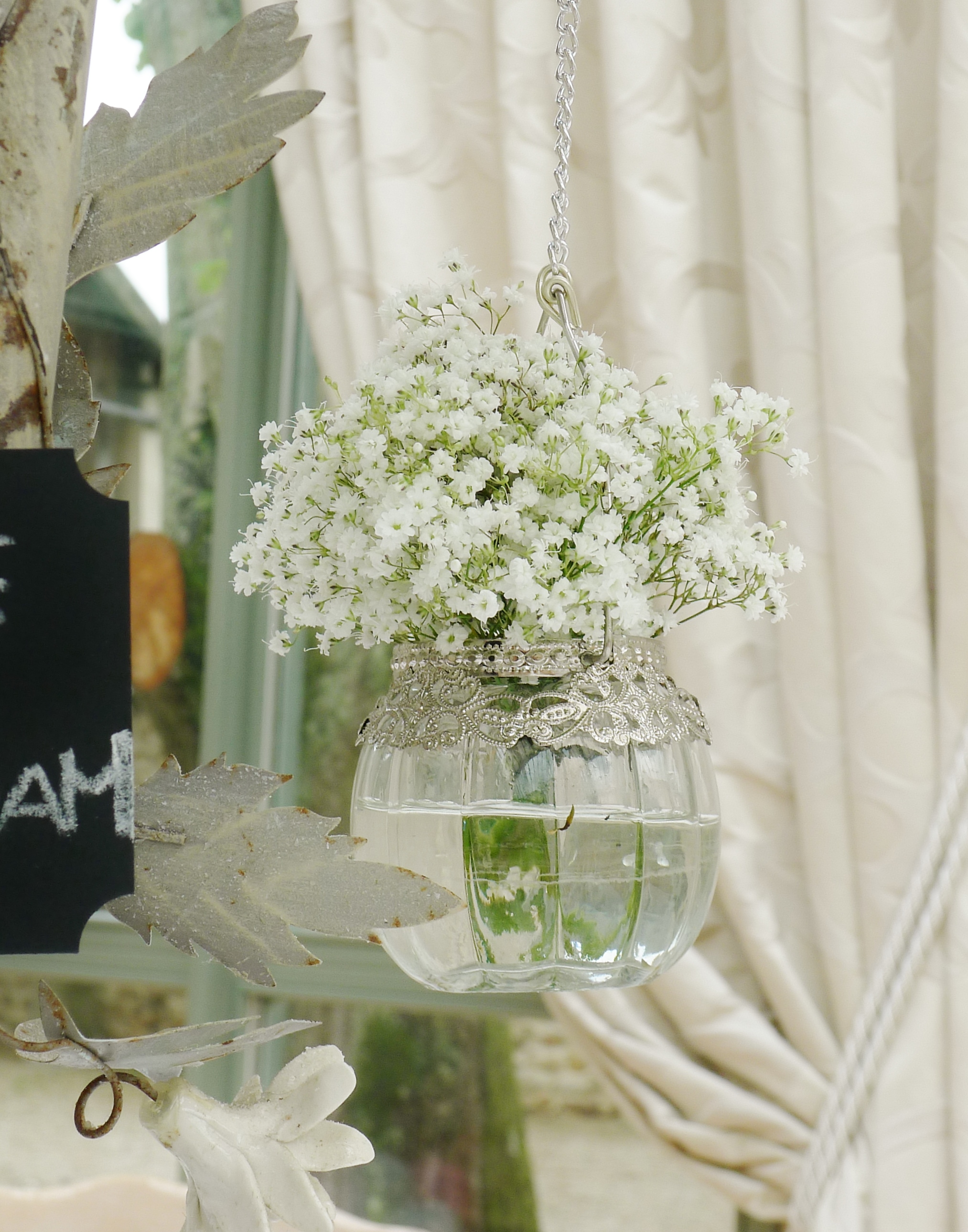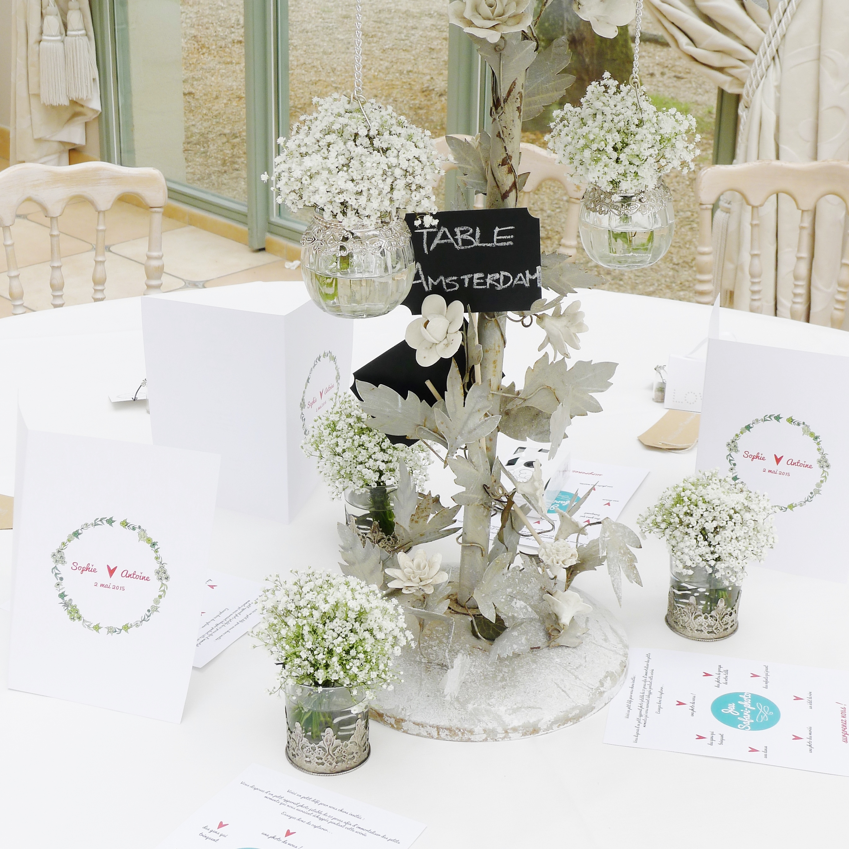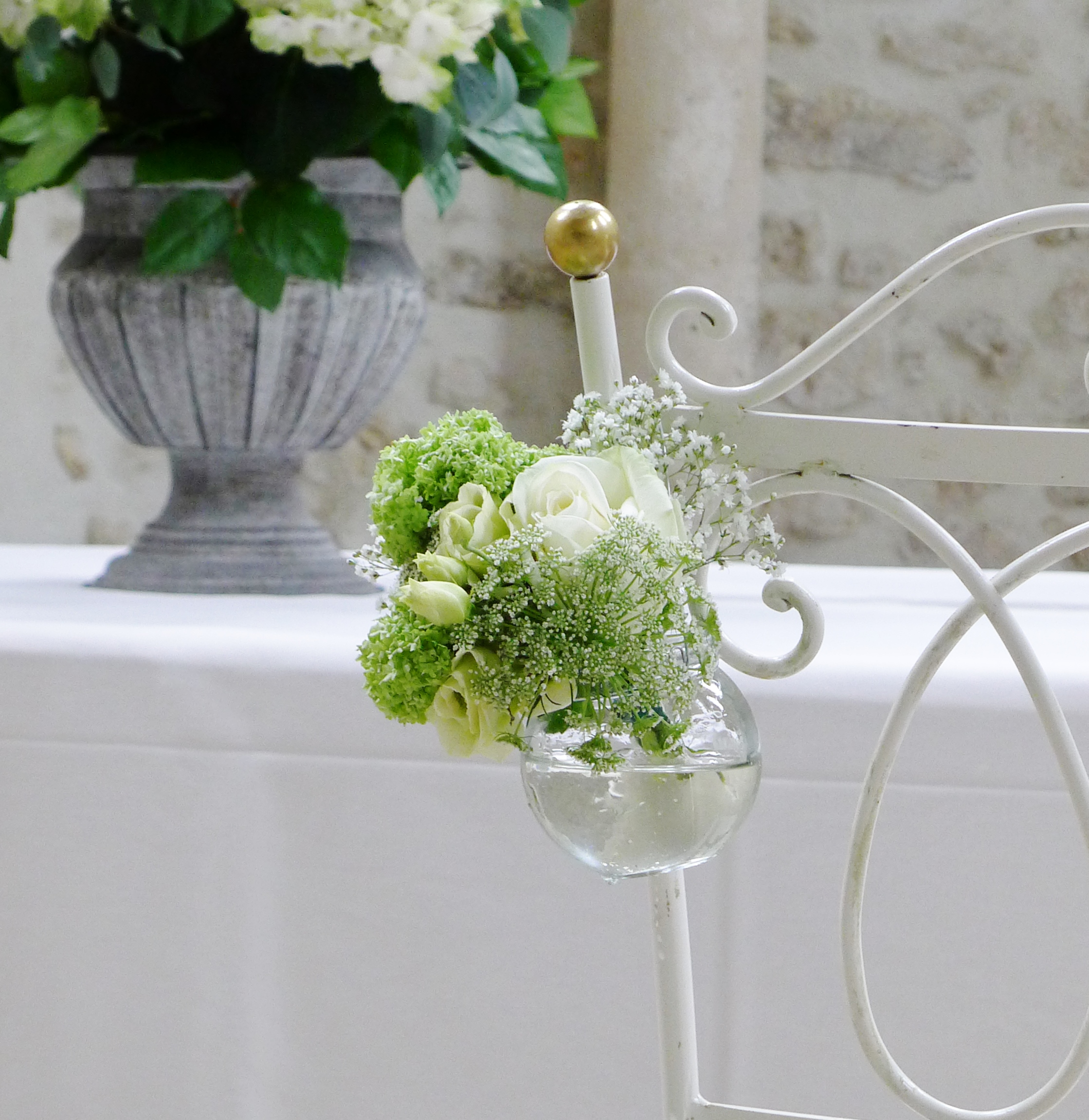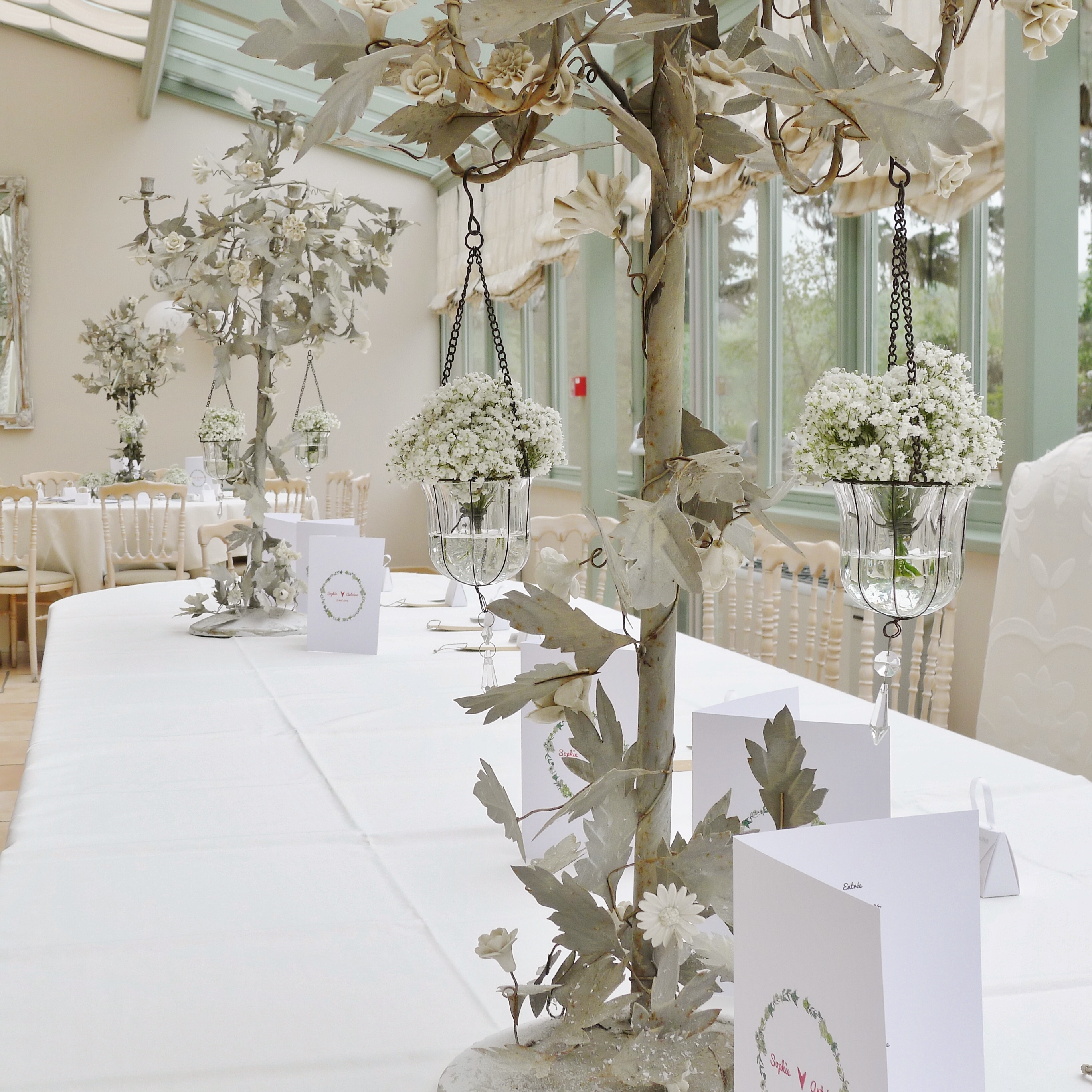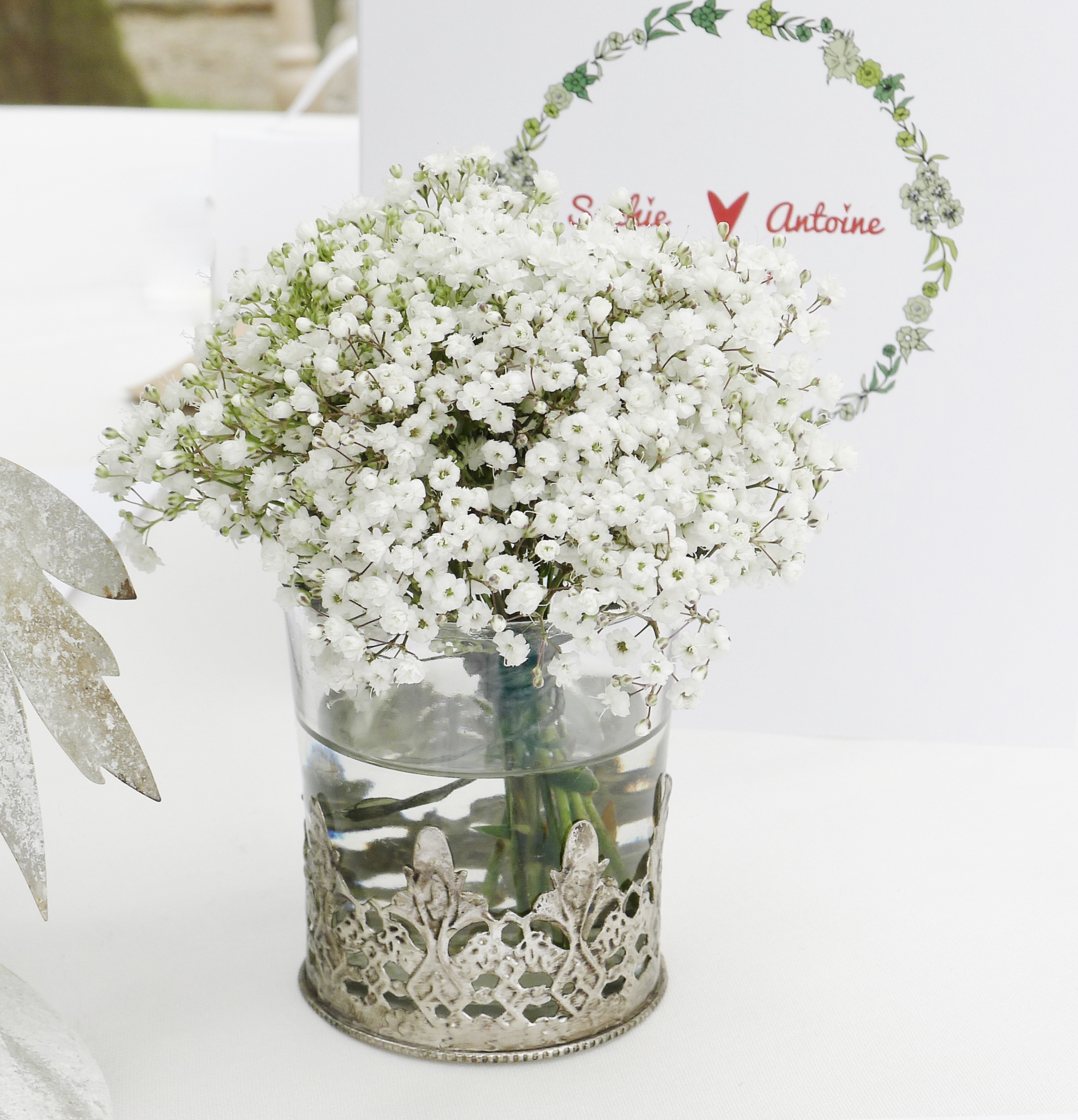 Sophie et Antoine ont choisi de se fondre dans la nature avec des compositions dans les verts et blancs. Les chandeliers ouvragés des tables étaient ornés de suspensions de gypsophile, accompagnés de 3 photophores de gypsophile au pied.