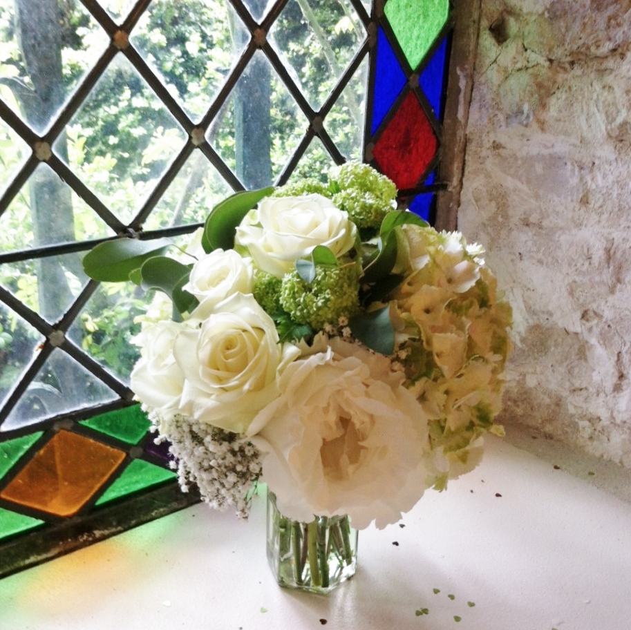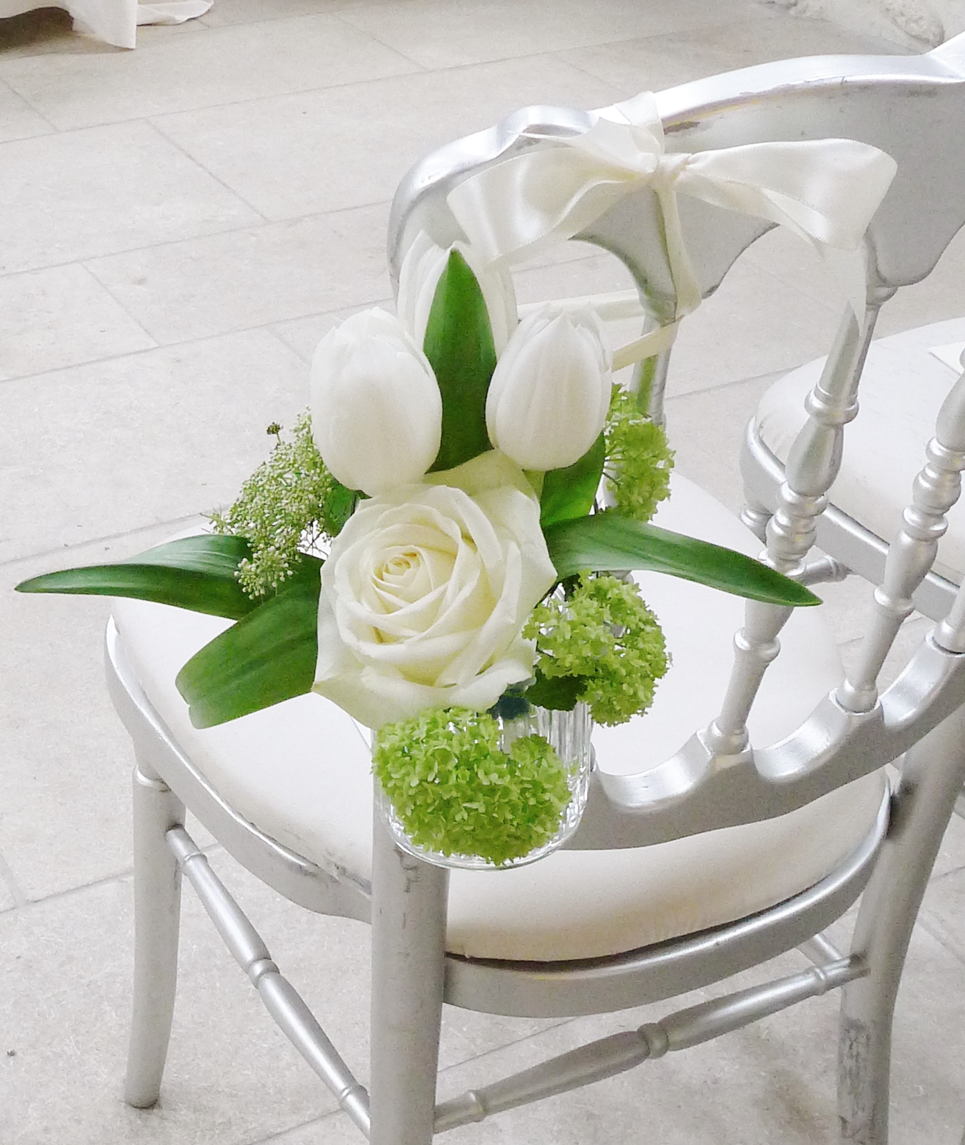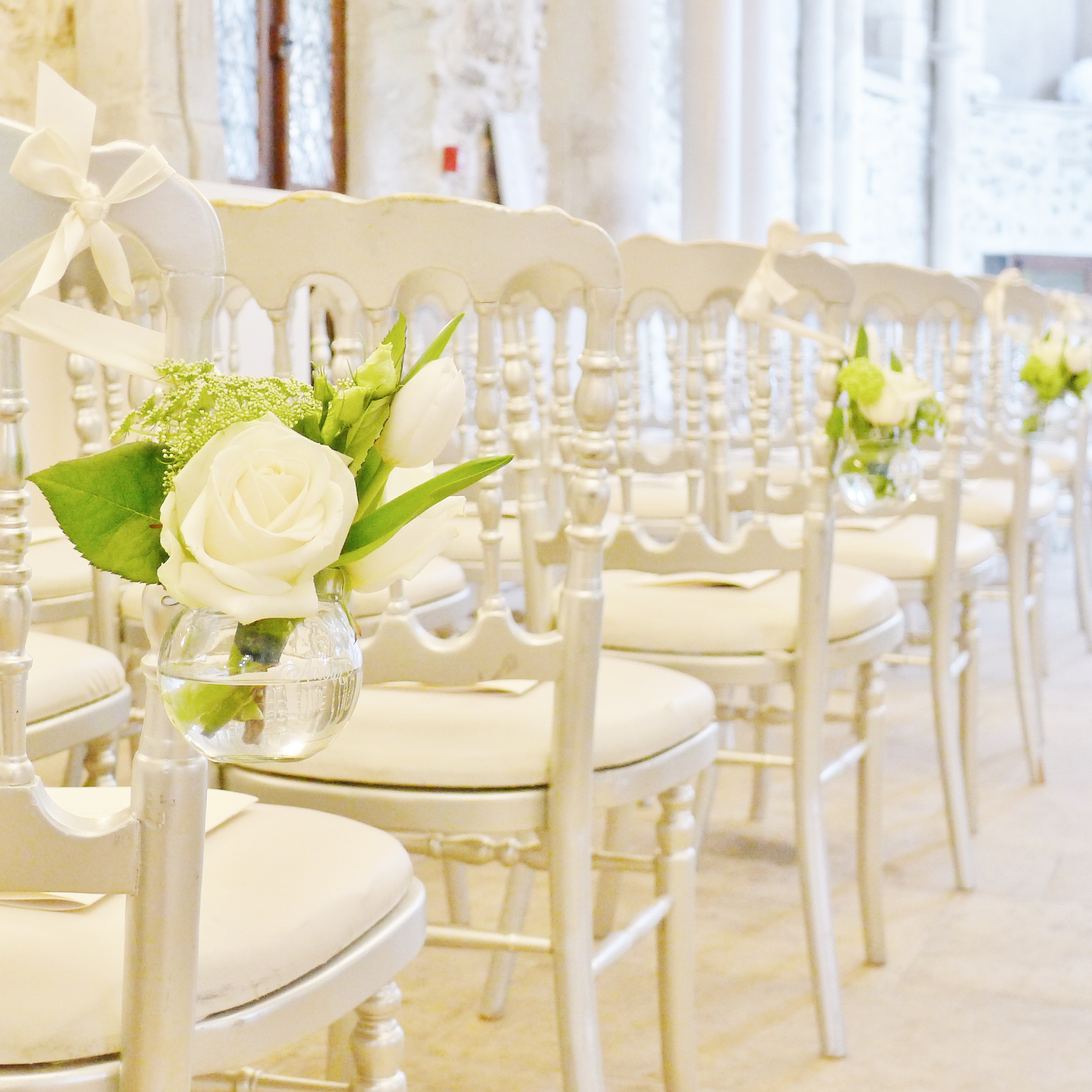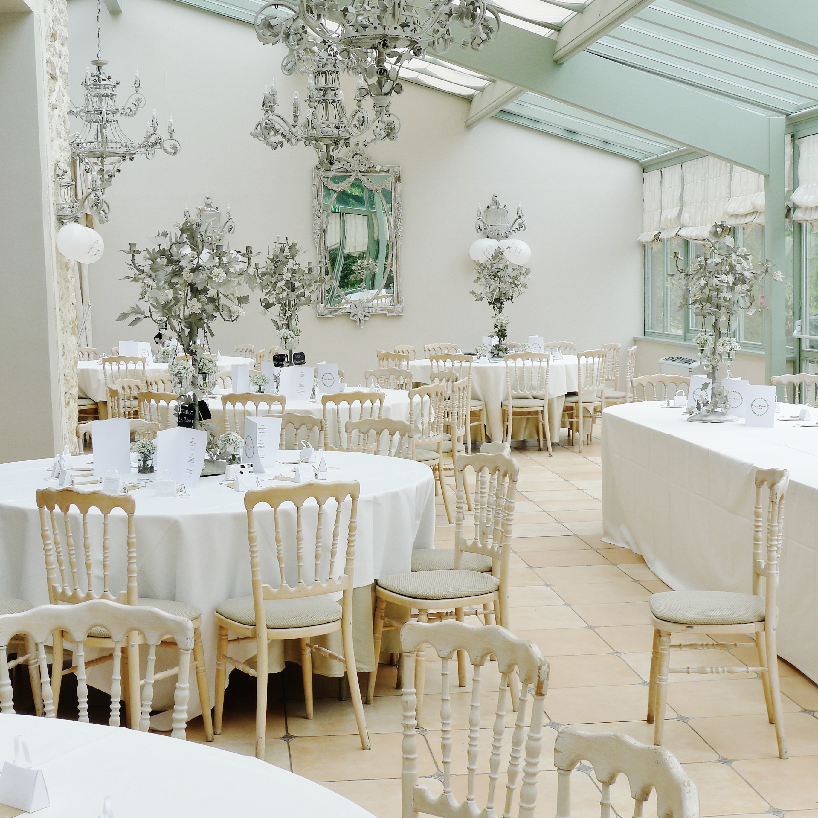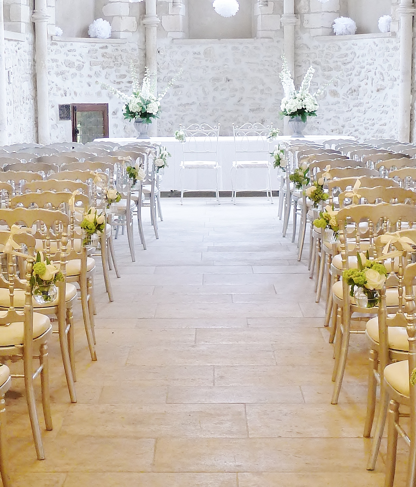 Sophie et Antoine ont choisi de se fondre dans la nature avec des compositions dans les verts et blancs. Les chandeliers ouvragés des tables étaient ornés de suspensions de gypsophile, accompagnés de 3 photophores de gypsophile au pied.