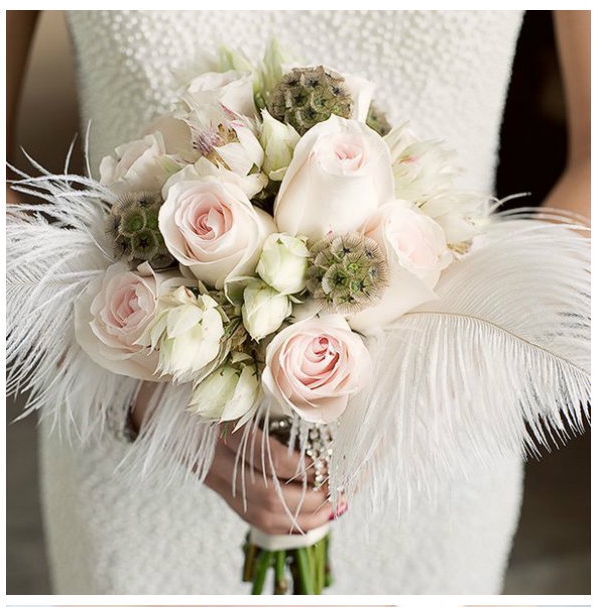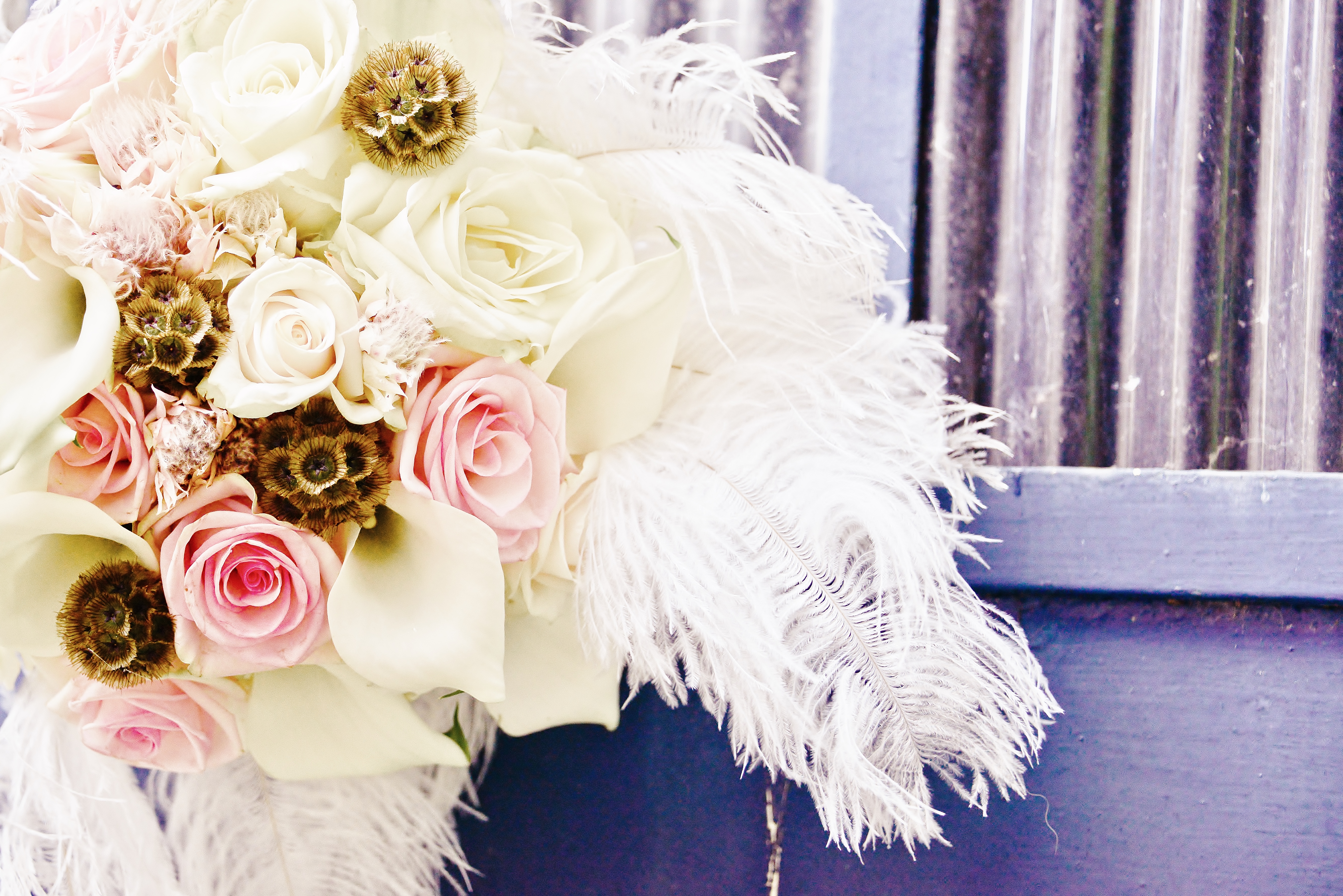 Plumes d’autruche, scabieuses, blushing bride, callas et roses. La photo d’inspiration, elle l’a trouvé dans un de mes articles l’hiver dernier sur les plumes dans les bouquets « prête moi ta plume » :